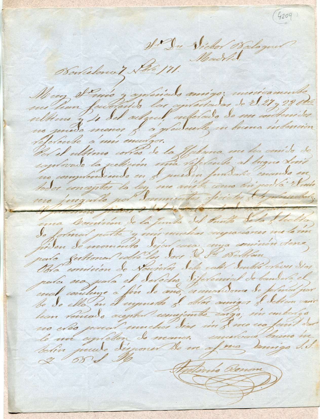 TextPublisher: Barcelona / 07/11/1871Addressee: Balaguer, Víctor, 1824-1901, destinatariSubject(s): sol·licitud- agilització tràmitsOnline resources: