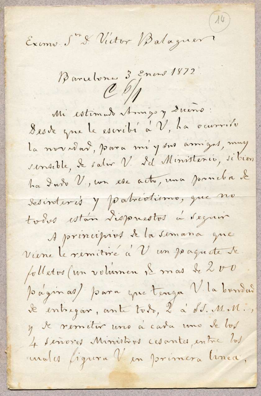 TextPublisher: Barcelona / 03/01/1872Addressee: Balaguer, Víctor, 1824-1901, destinatariSubject(s): Ruiz Zorrilla | Rios Rosas | Olózaga, Salustiano de | Figuerola, Laureà, 1816-1903 | política- anàlisi i propostesOnline resources: