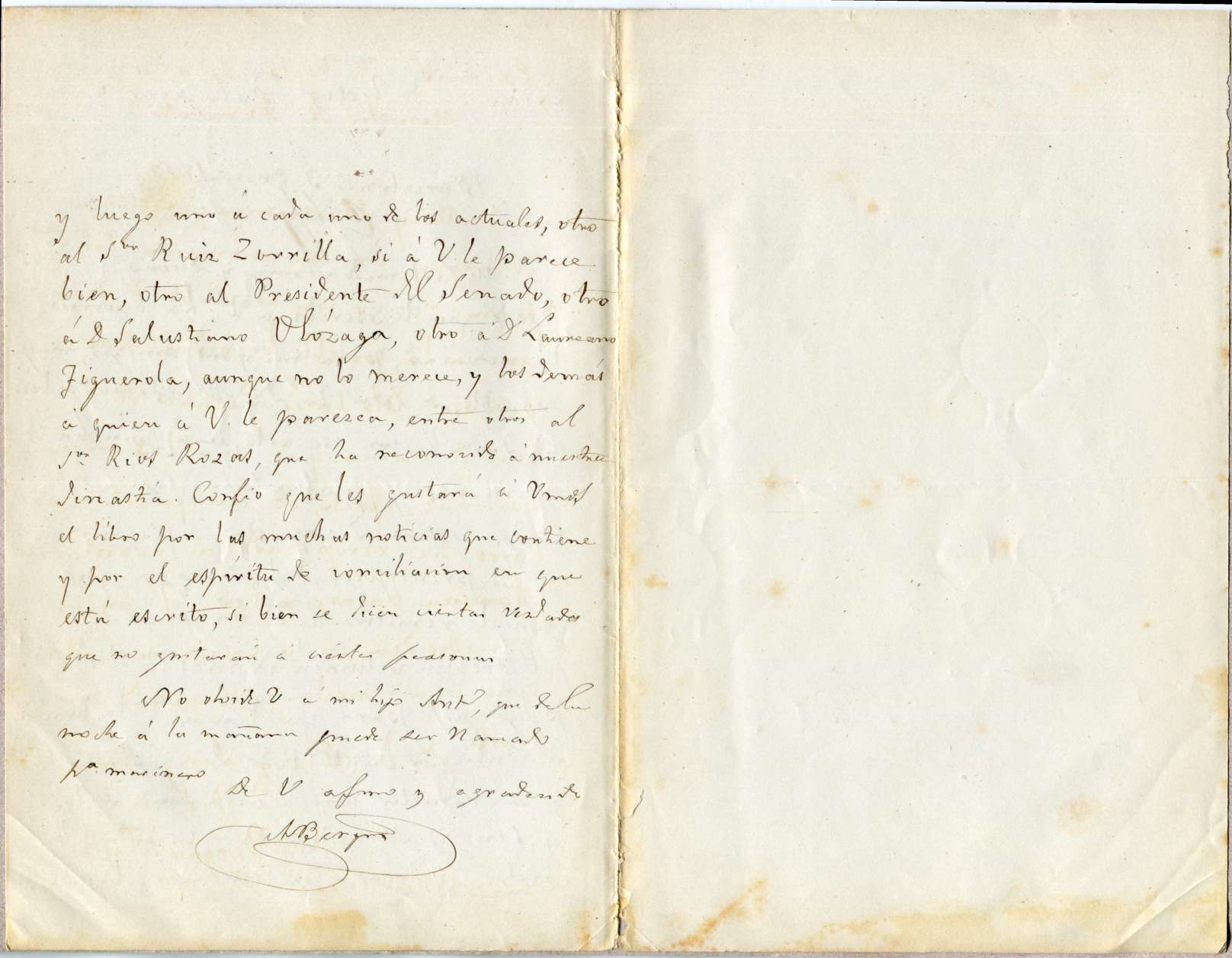 Summary: La dimissió del ministeri l'honora i el felicita per la seva patriòtica conducta. Li anuncia que li envia un paquet amb el fullet que ha publicat perquè el reparteixi entre els ministres que han dimitit i entre els actuals, i les altres personalitats polítiques del moment. Suposa que els hi agradarà perquè conté notícies i pel to conciliador del contingut.Summary: La dimissió del ministeri l'honora i el felicita per la seva patriòtica conducta. Li anuncia que li envia un paquet amb el fullet que ha publicat perquè el reparteixi entre els ministres que han dimitit i entre els actuals, i les altres personalitats polítiques del moment. Suposa que els hi agradarà perquè conté notícies i pel to conciliador del contingut.