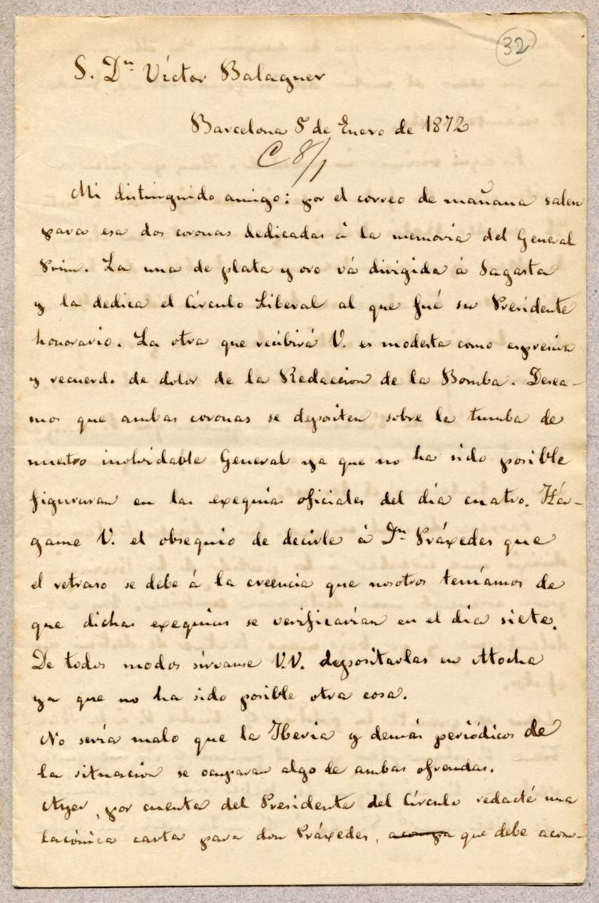 TextPublisher: Barcelona / 05/01/1872Addressee: Balaguer, Víctor, 1824-1901, destinatariSubject(s): Prim i Prats, Joan | Ratés | "Iberia, La" | "Bomba, La" | Círculo Liberal | Sagasta, Práxedes Mateo | Figuerola, Laureà, 1816-1903 | política- Prim- exèquiesOnline resources: