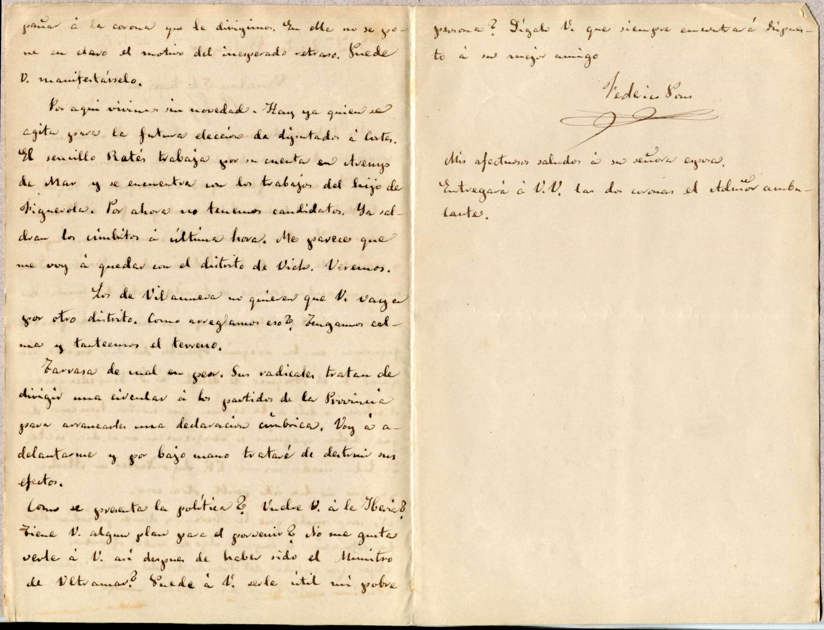 Summary: Explica el motiu pel qual les dues corones que envia han arribat tard. Demana que les col·loqui juntament amb la resta. El posa al corrent dels treballs preparatius de les eleccions als districtes d'Arenys, Terrassa i Vilanova. No li agrada l'actual situació de Balaguer després d'haver estat ministre d'Ultramar. Es posa a la seva disposició.Summary: Explica el motiu pel qual les dues corones que envia han arribat tard. Demana que les col·loqui juntament amb la resta. El posa al corrent dels treballs preparatius de les eleccions als districtes d'Arenys, Terrassa i Vilanova. No li agrada l'actual situació de Balaguer després d'haver estat ministre d'Ultramar. Es posa a la seva disposició.