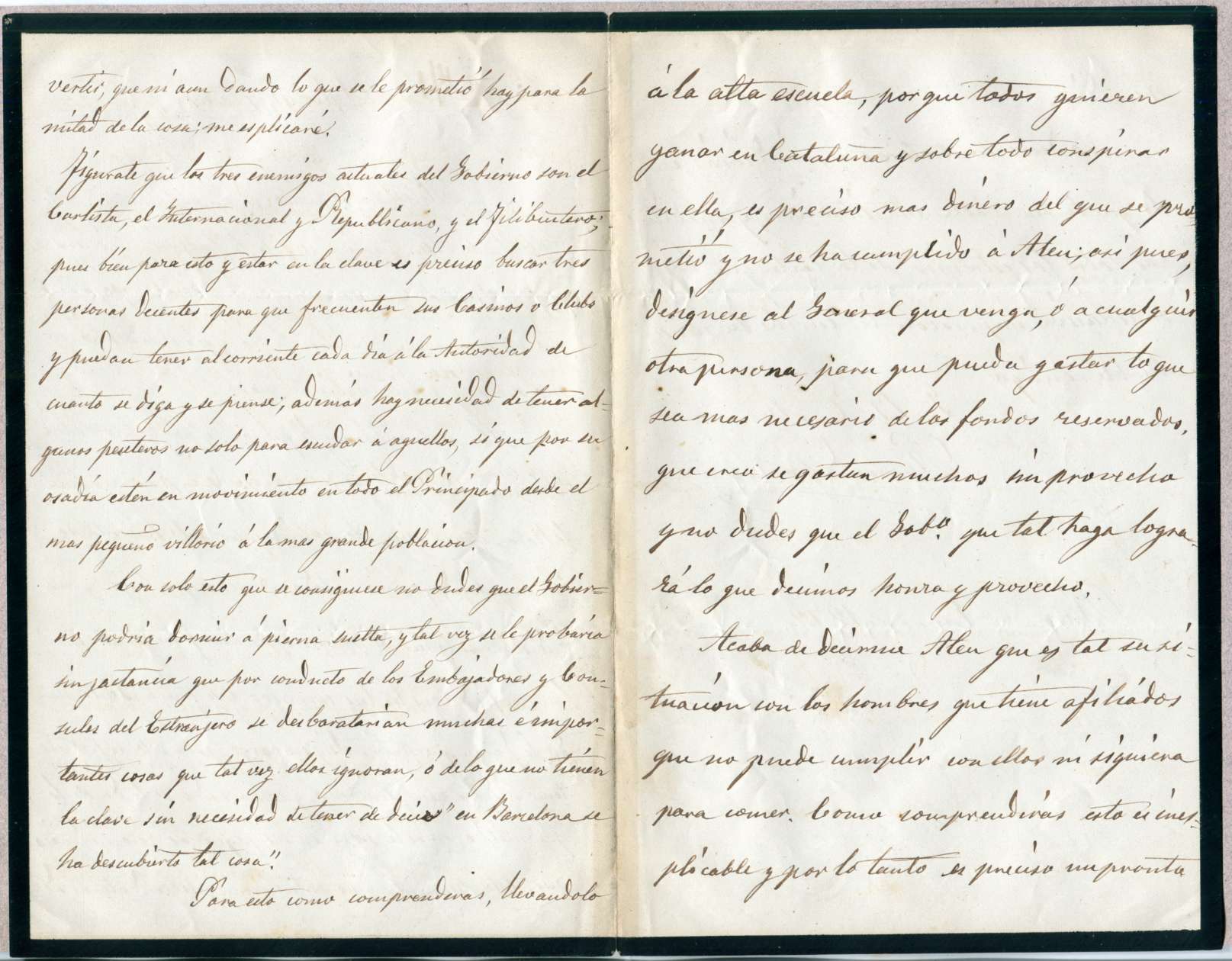 Summary: Planteja tota una estratègia per poder fer front als tres enemics del govern: carlisme, Internacional i república i filibusters. Cal introduir dins els seus casinos a tres persones decents que puguin passar informació des de dins a més de «peseteros» escampats per tot el territori que puguin sevir d'escut a aquells. També caldria utilitzar els embaixadors i cònsuls. Per a poder «conspirar» d'aquesta manera calen més diners dels que es reben actualment. Li demana que envii un general que pugui disposar amb llibertat dels fons reservats.Summary: Planteja tota una estratègia per poder fer front als tres enemics del govern: carlisme, Internacional i república i filibusters. Cal introduir dins els seus casinos a tres persones decents que puguin passar informació des de dins a més de «peseteros» escampats per tot el territori que puguin sevir d'escut a aquells. També caldria utilitzar els embaixadors i cònsuls. Per a poder «conspirar» d'aquesta manera calen més diners dels que es reben actualment. Li demana que envii un general que pugui disposar amb llibertat dels fons reservats.