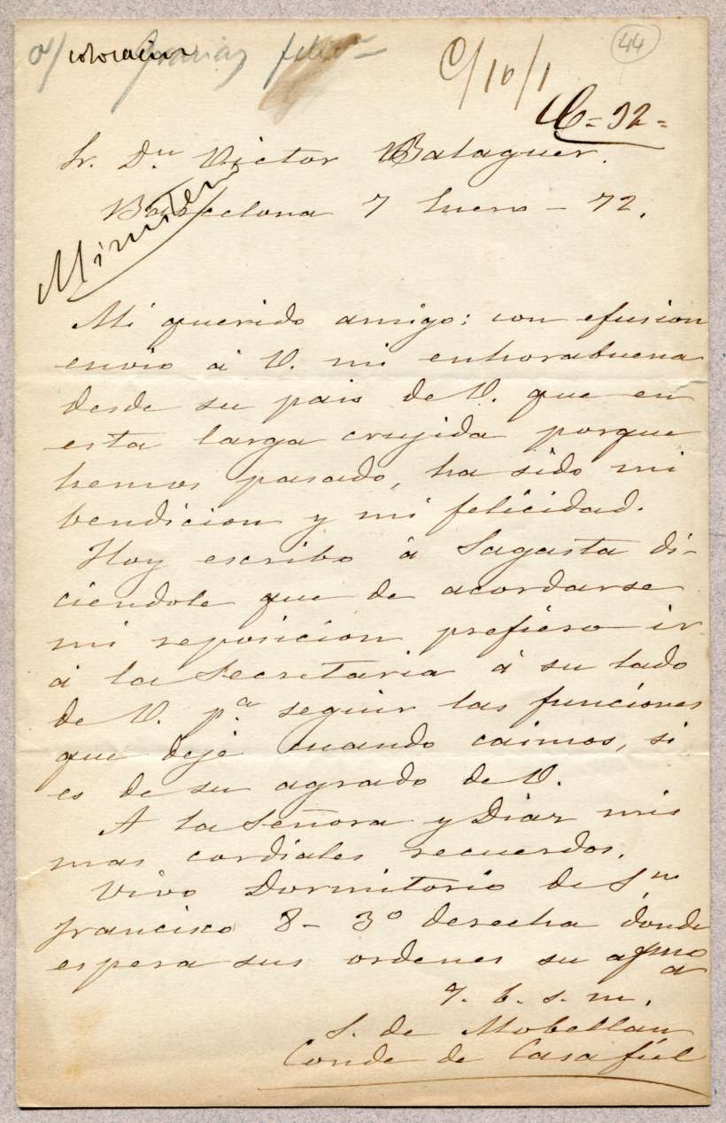 TextPublisher: Barcelona / 07/01/1872Addressee: Balaguer, Víctor, 1824-1901, destinatariSubject(s): sol·licitud- treballOnline resources: