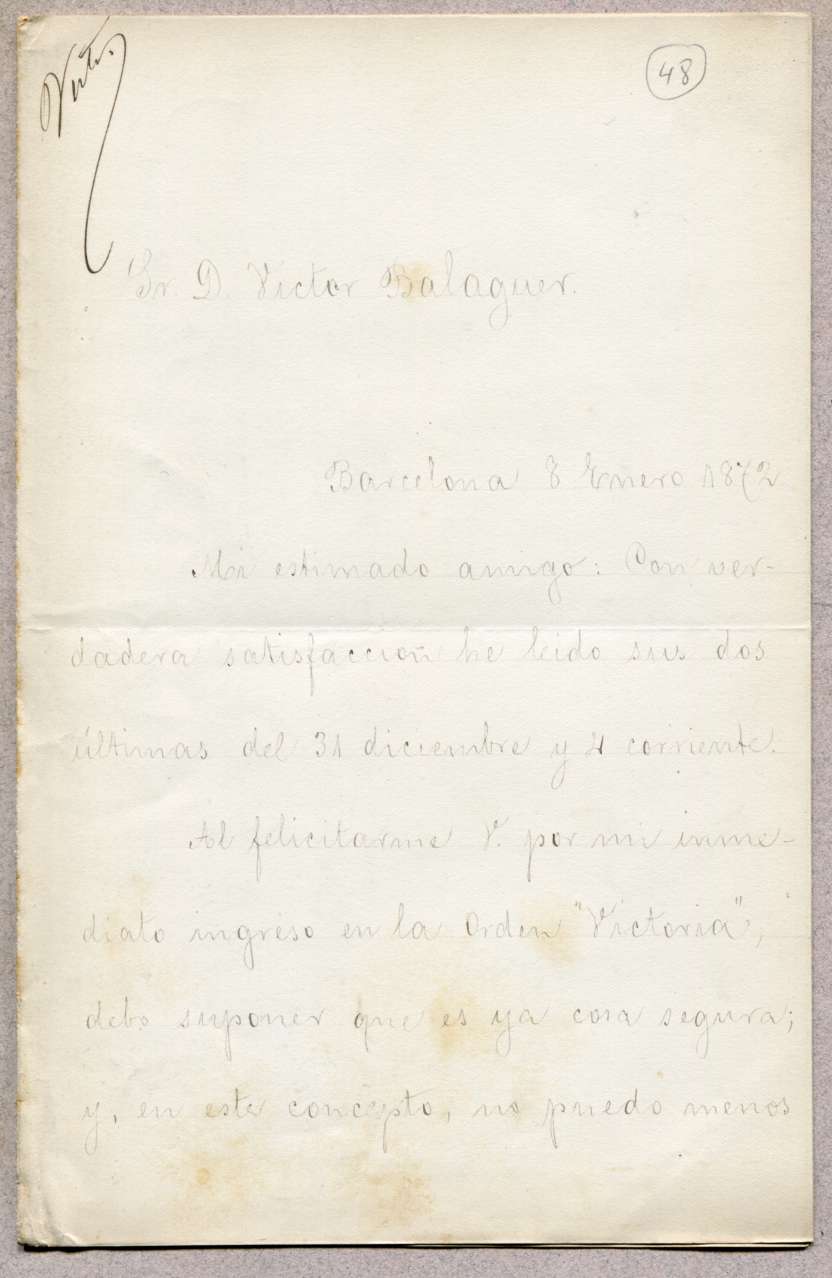 TextPublisher: Barcelona / 08/01/1872Addressee: Balaguer, Víctor, 1824-1901, destinatariSubject(s): varis- agraïment- condecoracióOnline resources: