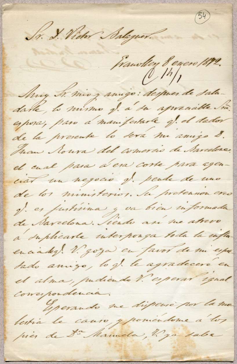 TextPublisher: Granollers / 08/01/1872Addressee: Balaguer, Víctor, 1824-1901, destinatariSubject(s): Roura, Juan | sol·licitud- recomanacióOnline resources: