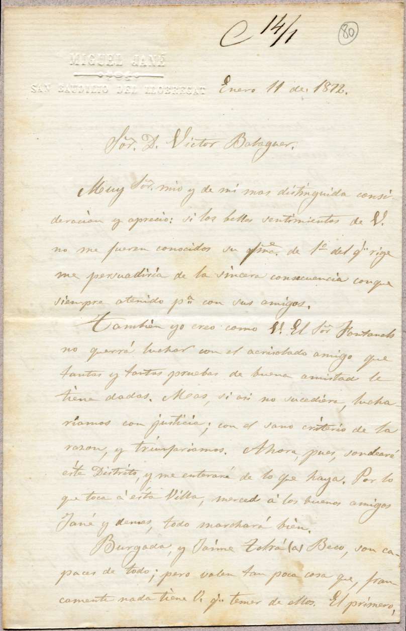 TextPublisher: Sant Boi de Llobregat / 11/01/1872Addressee: Balaguer, Víctor, 1824-1901, destinatariSubject(s): Miguel Jané (Capçalera) | Sol y Miró | Calaf | Parellada | Tolrà , Jaime (a) Beco | Burgada | Fontanals | eleccions generals- candidaturesOnline resources: