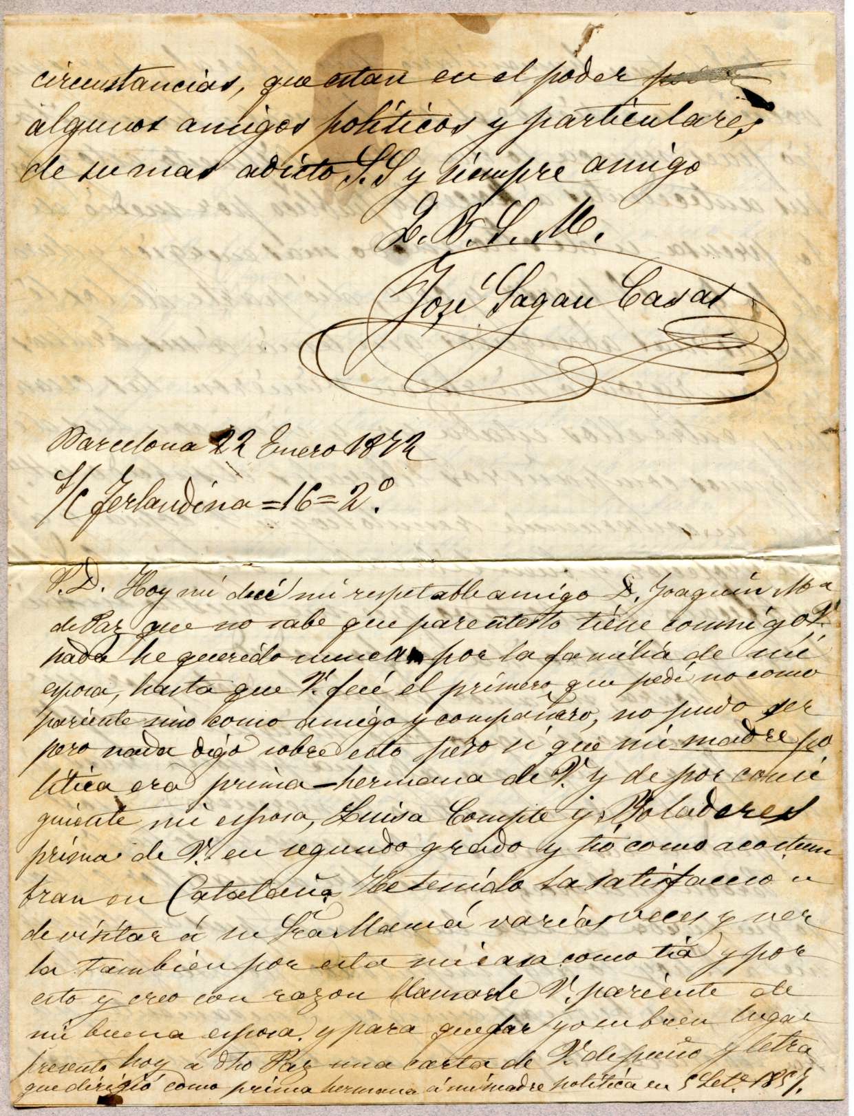 TextPublisher: Barcelona / 22/01/1872Addressee: Balaguer, Víctor, 1824-1901, destinatariSubject(s): Paz, Joaquin Ma. de | Compte y Boladeras, Luisa | política- Estat Espanyol- crisi de governOnline resources: