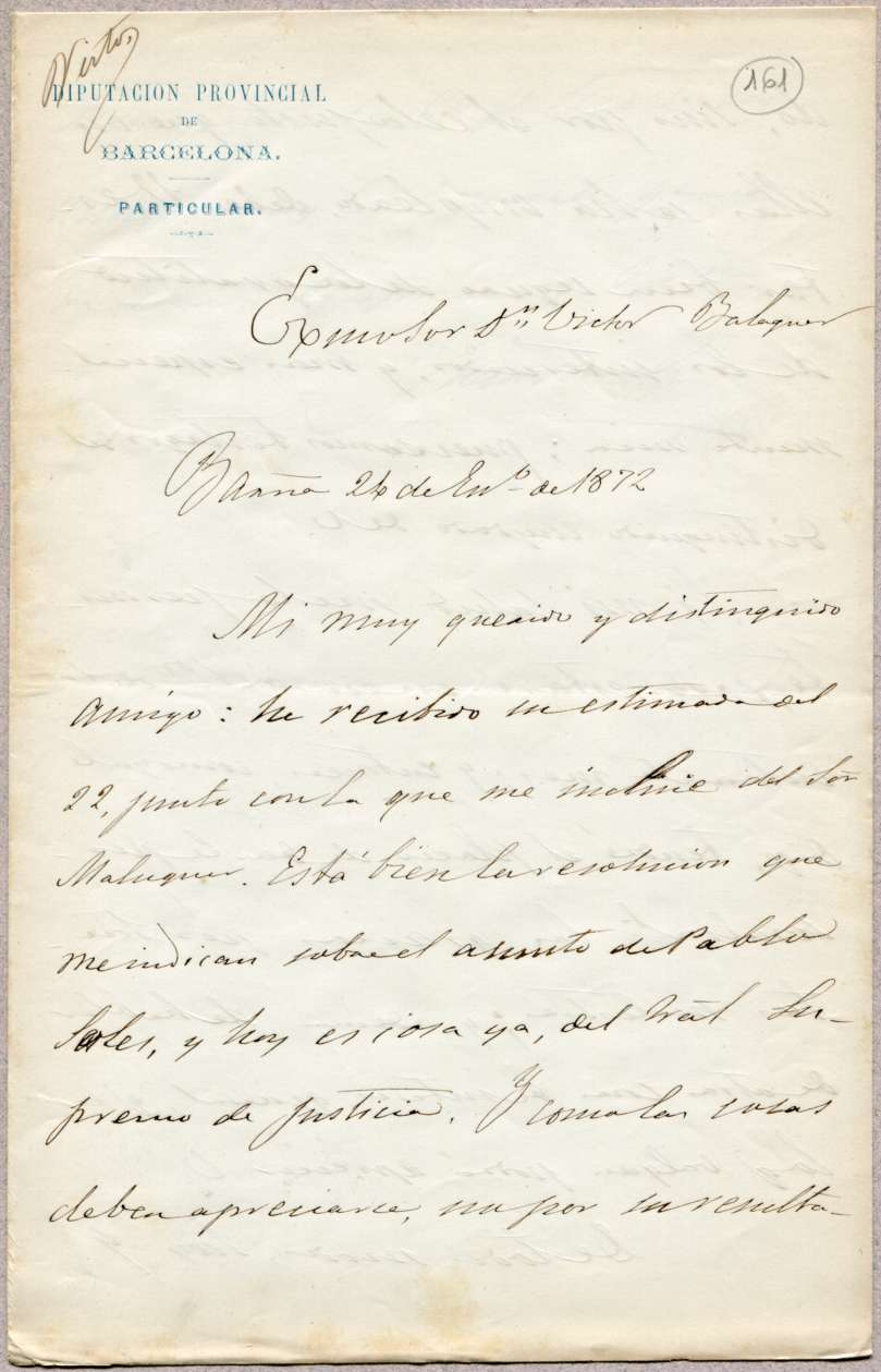 TextPublisher: Barcelona / 24/01/1872Addressee: Balaguer, Víctor, 1824-1901, destinatariSubject(s): Diputacion Provincial de Barcelona. Particular (Capçalera) | Soler, Pablo | Maluquer | varis- agraïment- tràmits judicialsOnline resources: