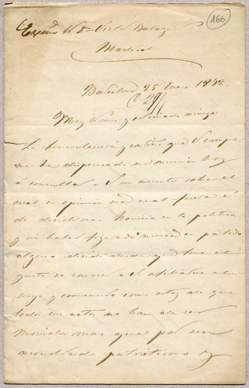 TextPublisher: Barcelona / 25/01/1872Addressee: Balaguer, Víctor, 1824-1901, destinatariSubject(s): eleccions generals- candidatures | urbanisme i obres públiques- carretera Pons a Seu d'UrgellOnline resources: