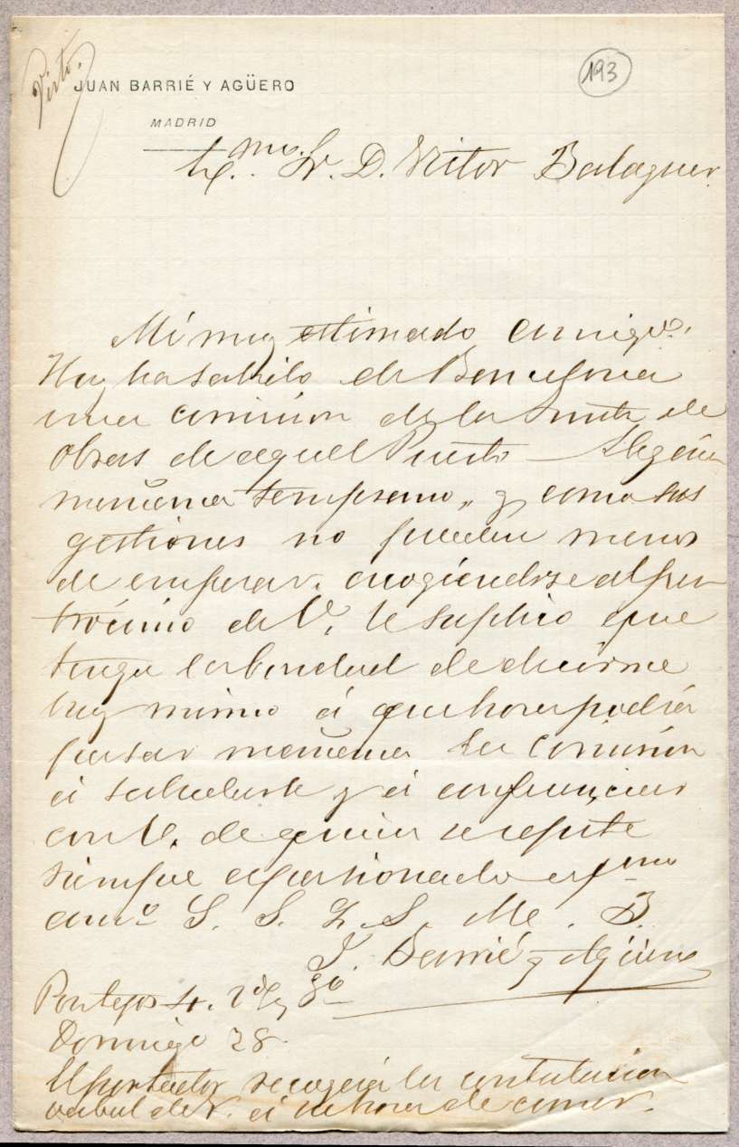 TextPublisher: Barcelona / 28/01/1872Addressee: Balaguer, Víctor, 1824-1901, destinatariSubject(s): urbanisme i obres públiques- port de BarcelonaOnline resources: