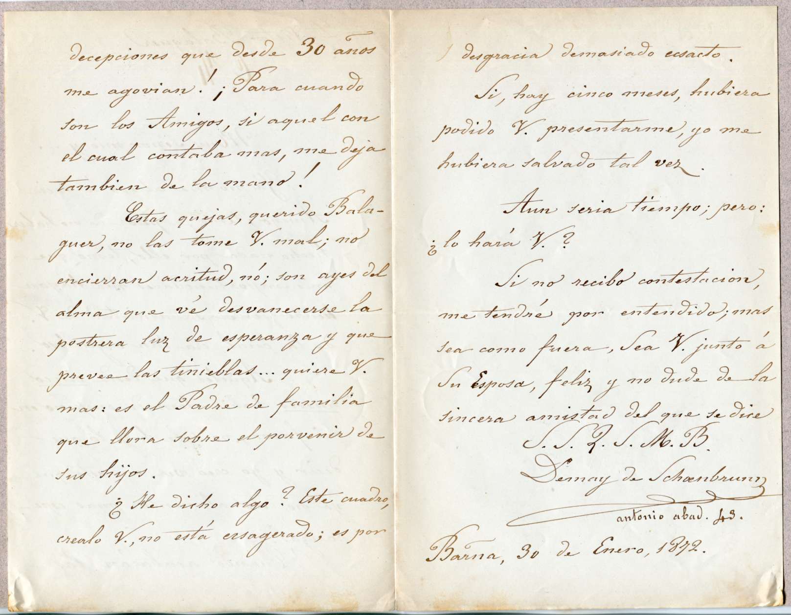 TextPublisher: Barcelona / 30/01/1872Addressee: Balaguer, Víctor, 1824-1901, destinatariSubject(s): familiar i/o personalOnline resources:
