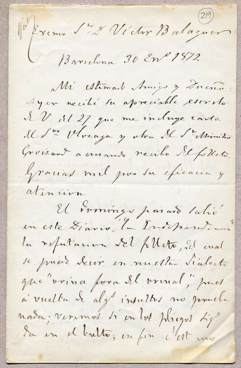 TextPublisher: Barcelona / 30/01/1872Addressee: Balaguer, Víctor, 1824-1901, destinatariSubject(s): Olózaga | Castroverde | "Independencia, La" | Groizard, Carlos | literatura- prosa- obres d'altres autors | economia- impostos- críticaOnline resources: