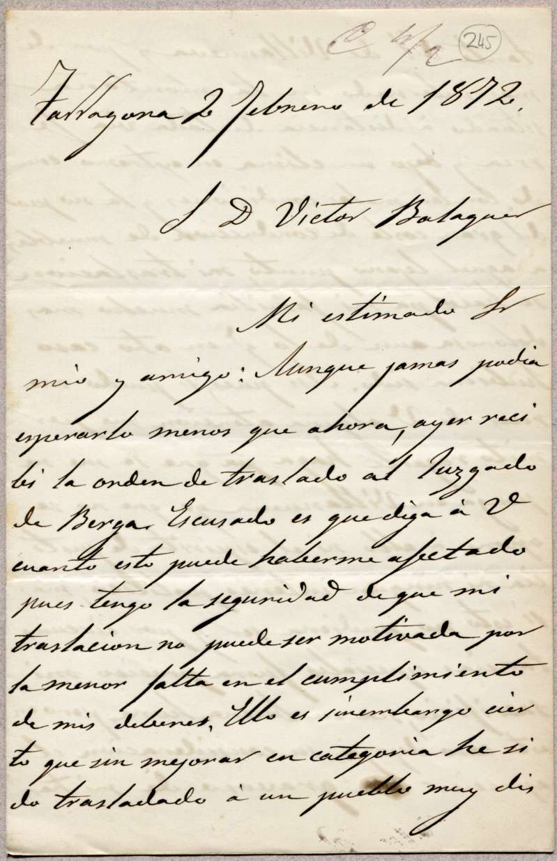 TextPublisher: Tarragona / 02/02/1872Addressee: Balaguer, Víctor, 1824-1901, destinatariSubject(s): sol·licitud- reposició al lloc de treballOnline resources: