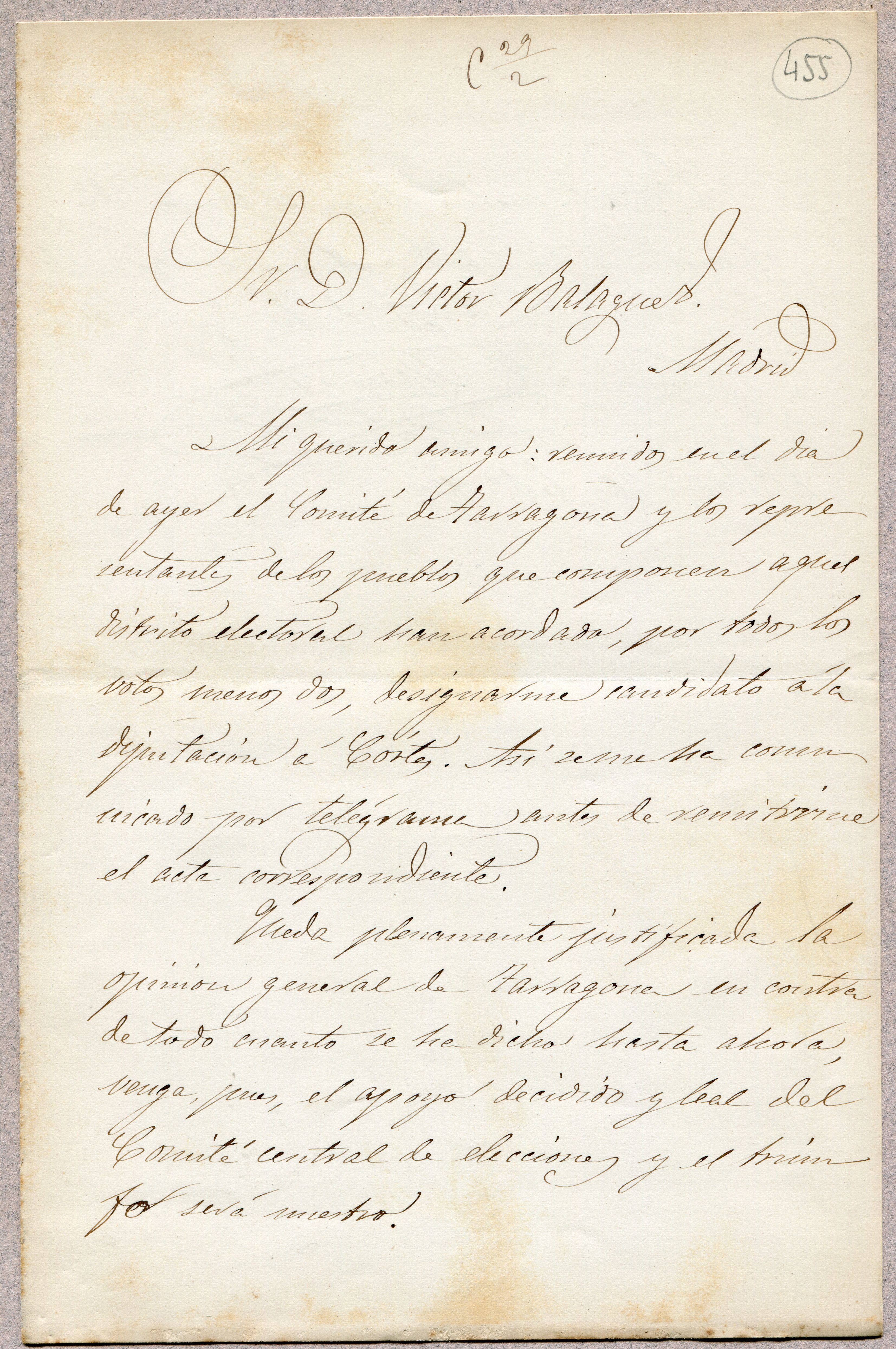 TextPublisher: Barcelona / 26/02/1872Addressee: Balaguer, Víctor, 1824-1901, destinatariSubject(s): eleccions generals- candidaturesOnline resources: