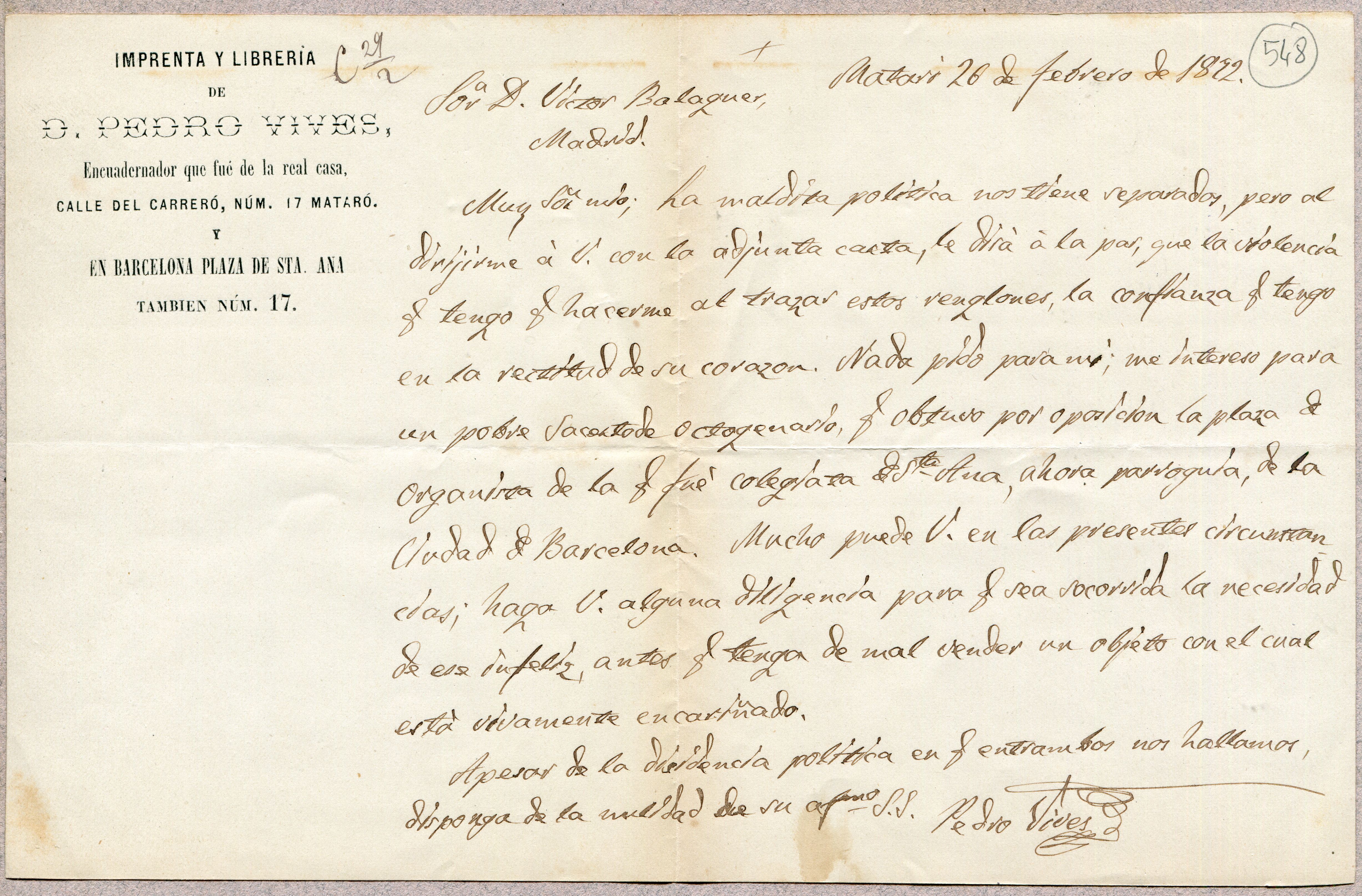 TextPublisher: Mataró / 26/02/1872Addressee: Balaguer, Víctor, 1824-1901, destinatariSubject(s): sol·licitud- recomanacióOnline resources: