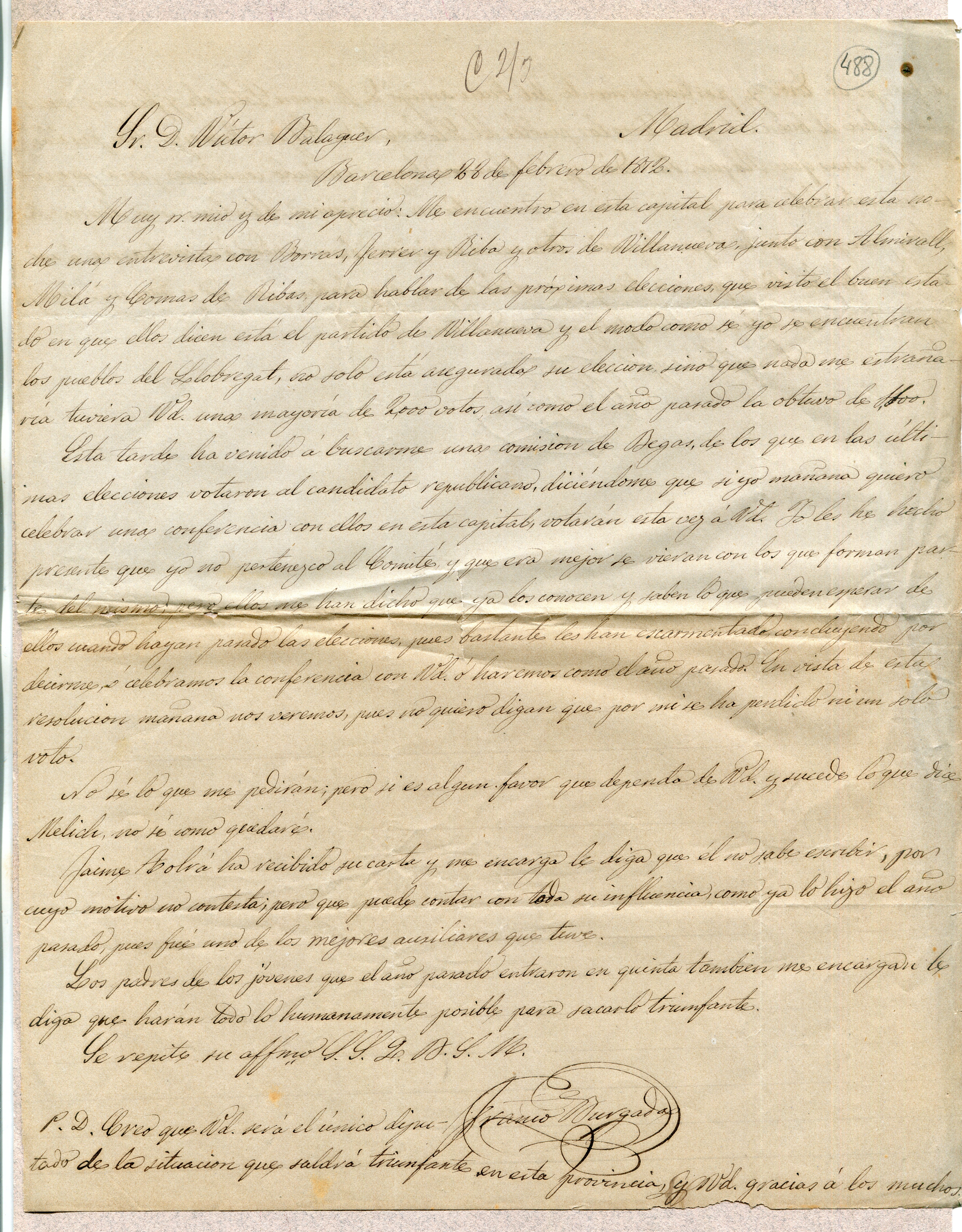 TextPublisher: Barcelona / 28/02/1872Addressee: Balaguer, Víctor, 1824-1901, destinatariSubject(s): Borràs Magriñà, Josep | Tolrà, Jaime | Melich, Juan | Milà i Artigas, Josep Antoni | Comas | Almirall | Riba | Ferrer i Vidal, Josep | eleccions generals- candidatures (VB)Online resources: