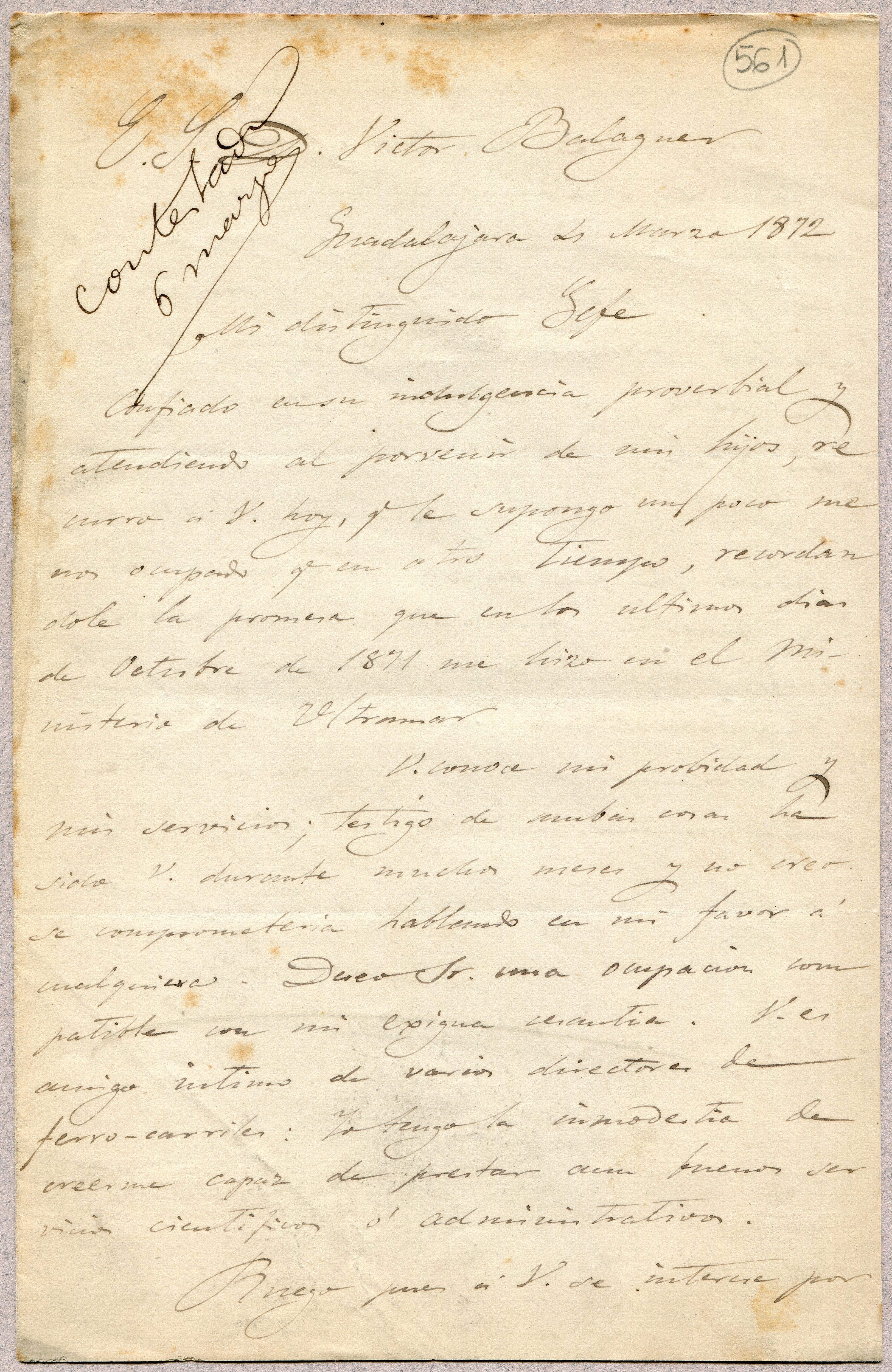 TextPublisher: Guadalajara / 04/03/1872Addressee: Balaguer, Víctor, 1824-1901, destinatariSubject(s): sol·licitud- treballOnline resources: